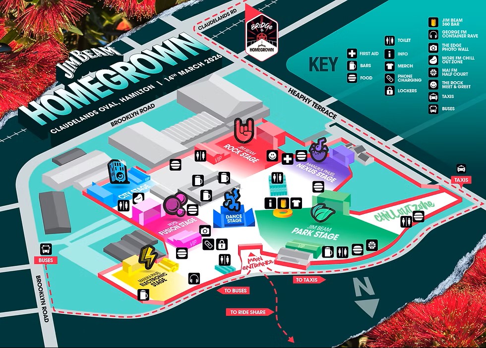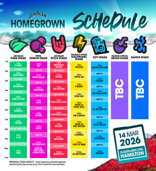 The Waikato welcomes Jim Beam Homegrown to Claudelands Oval on Saturday, 14 March with a lineup showcasing the best of Aotearoa's music scene plus even more excitement and entertainment to be announced!