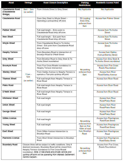 There will be a dedicated Uber/private drop-off zone located at the Settlement Centre on Boundary Road, this zone is for drop offs only with no parking during the day. The taxi loop for this event is as follows, Stanley Street ➡ Heaphy Terrace ➡ Thames St (managed by Hamilton Taxis).